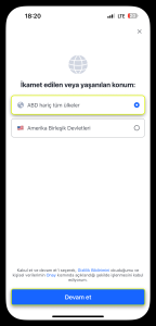 Bu adımda ikamet ettiğiniz ülke bilgisi istenir. Eğer, vatandaş olmanız fark etmeksizin, ABD’de ikamet ediyorsanız başvurunuz sonuçlanamaz. Böyle bir durum söz konusu değilse “ABD hariç tüm ülkeler” seçeneğini işaretleyerek devam edebilirsiniz.
