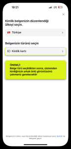 Burada, kimliğinizin düzenlendiği ülkeyi ve belge türünü seçmeniz istenir. Türkiye’de doğrulama süreci için Türkiye’de düzenlenmiş çipli T.C. kimlik kartı gerekir.
