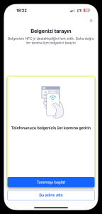 Cihazınızın NFC okuyucusunu kullanarak kimlik kartınızı telefonun arka kısmına yaklaştırıp tarama işlemini başlatabilirsiniz.
